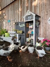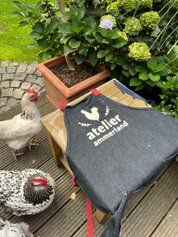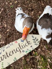 Mitten in diesem lebendigen Mosaik flitzen unsere freilaufenden Hühner mit fröhlichem Geschnatter über das Grundstück. Zusammen mit den stolzen Pommerngänsen, die aus Naturbrut stammen, bilden sie eine eingeschworene Gemeinschaft, die zu unserer Familie gehört. Die Gänse fühlen sich nicht nur auf der Weide, sondern auch am Teich wohl, wo sie gemächlich ihre Kreise ziehen und die idyllische Szenerie abrunden.